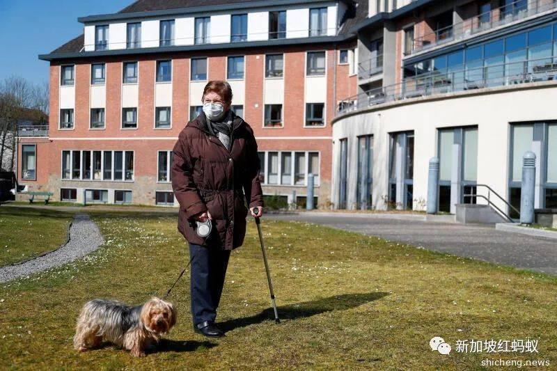 比利时疗养院一名86岁住户在封城期间遛狗散步。(路透社)