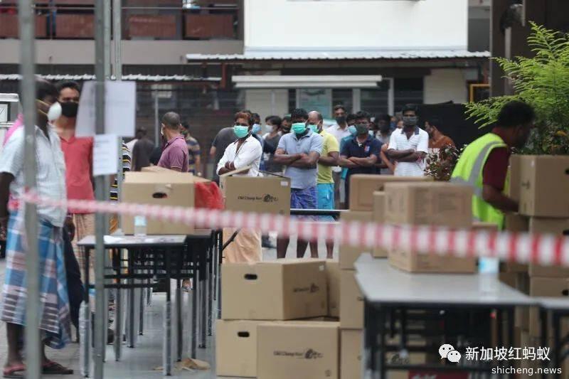 住在位于裕廊的客工宿舍的客工在排队取饭。(海峡时报)