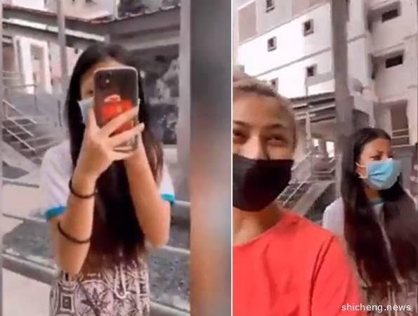 在组屋楼下抽烟的两名女生,倒转镜头拍,称自己已戴口罩,并未做错事(。(取自网络)