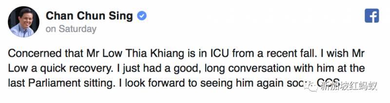 贸易部长陈振声在消息传出的第一时间,就在脸书上贴文为刘程强祝愿,而且还写道: “国会最近一次开会时,我和他(刘程强)曾经好好的聊了好一阵子”。