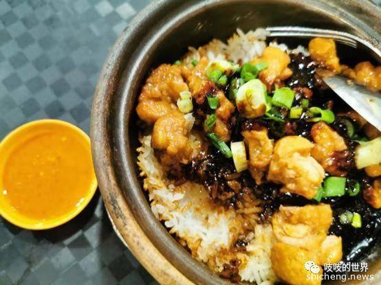 抱着吃完以后会吐槽朋友夸张的心态,点了一份砂锅饭,端上餐桌,映入眼帘的首先是它浓郁的酱汁以及满满一层的鸡肉和腊肠,小葱点缀,旁边还有自助的辣酱。