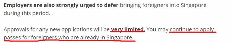 而人力部的网站上,政府则强烈建议雇主现阶段不要为外国籍员工申请工作准证。因为获批率将会极低。但如果是为目前在新加坡境内的外国人申请工签或续约,则可正常进行。