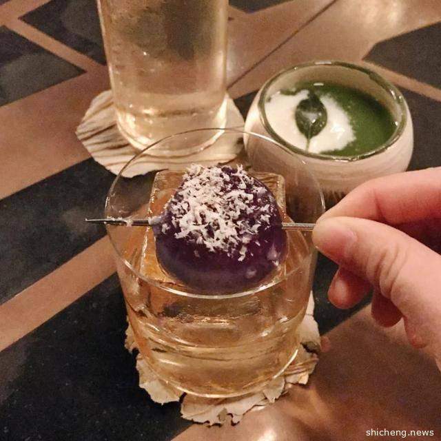 Native的调酒师会给每一位客人详尽地讲解他们的理念和每一杯酒的做法。比如这杯酒的灵感就来源于一种叫Peranakan的甜点,顶部是椰子、斑斓和蝶豆花做成的果冻,很有新加坡特色,确实是一家真正意义上的亚洲本土风味酒吧。