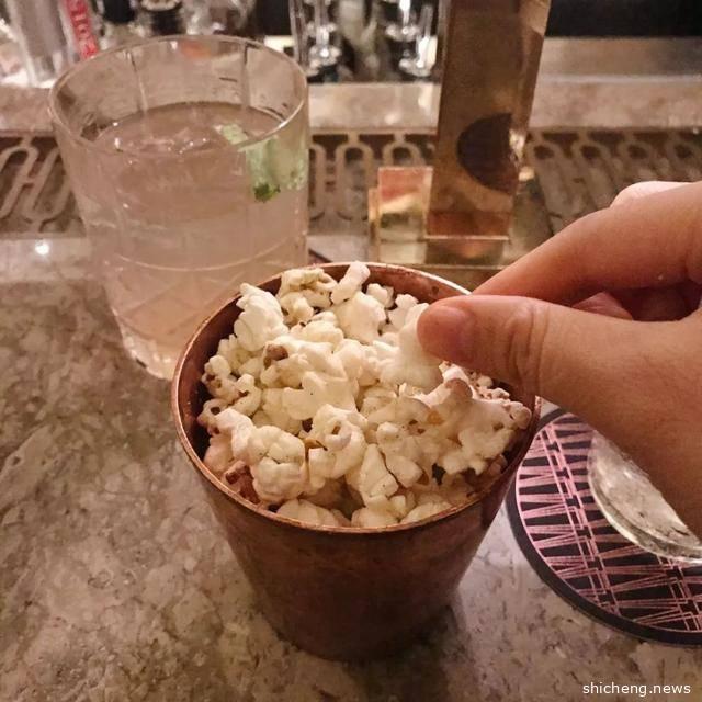 Btw,下酒的爆米花有点好吃,会吃上瘾哦,我们已经陆陆续续添了好几次了。临走时bartender还送了我们每人一shot酒,在新加坡的每一晚,都是微醺的啊~