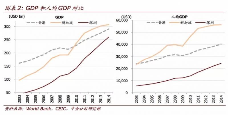 通过下面的图片我们可以看到,从2009年开始,新加坡的GDP总额迅速增长,超过了深圳和香港。而人均GDP一直都是很高的,可以说远远高于香港和深圳。