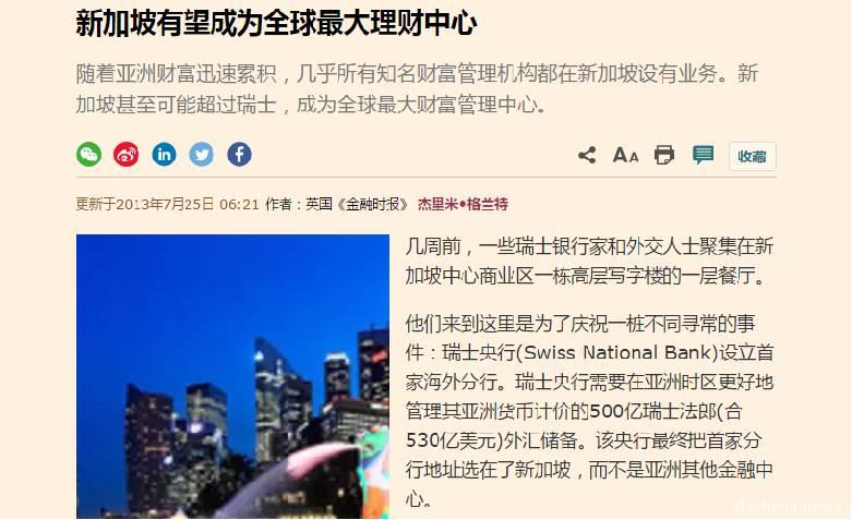 英国的《金融时报》曾经报道,瑞士央行把首家分行设在了新加坡,新加坡有望成为全球最大理财中心,而且这些年这个趋势更加明显。