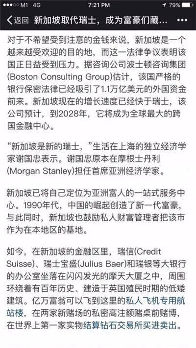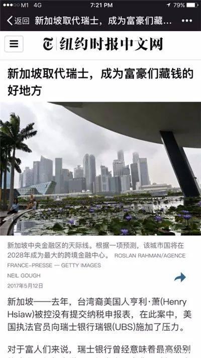 美国彭博社曾报道,新加坡将取代香港成为中国富人的新宠,美国《纽约时报》报道,新加坡取代瑞士,成为富豪们资产配置的好地方。