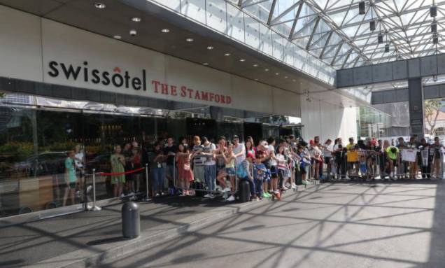超过200名粉丝今早聚集史丹福瑞士酒店(Swissotel The Stamford)门口,争睹偶像风采。