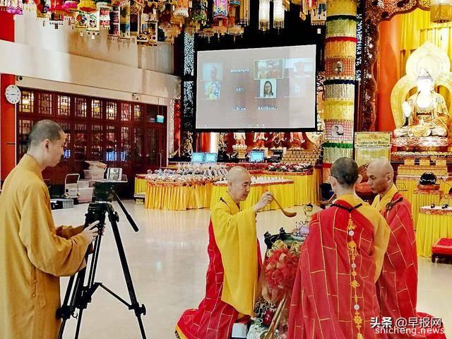 新加坡一座佛寺在今年的卫塞节现场直播浴佛法会,让待在家中的信徒能在线上参与。(新加坡吉祥宝聚寺提供)