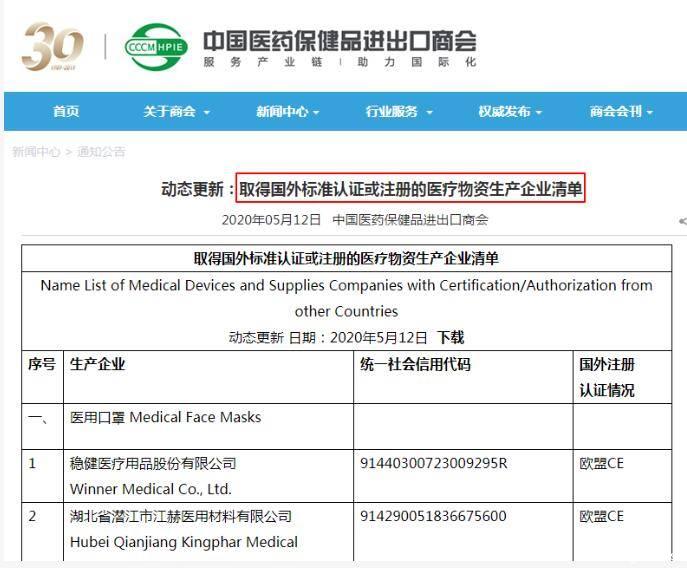 5月12日,再次更新了取得国外标准认证或注册的医疗物资生产企业清单与取得国外标准认证或注册的非医用口罩生产企业清单。