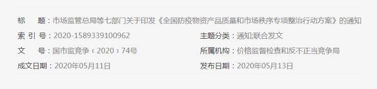 5月13日,市场监管总局等七部门印发《全国防疫物资产品质量和市场秩序专项整治行动方案》的通知,通知指出,着重对口罩、防护服、呼吸机、红外体温计(额温枪)、新型冠状病毒检测试剂等五类防疫物资及其重要原辅材料加强监管,保障防疫物资全产业链平稳运行。