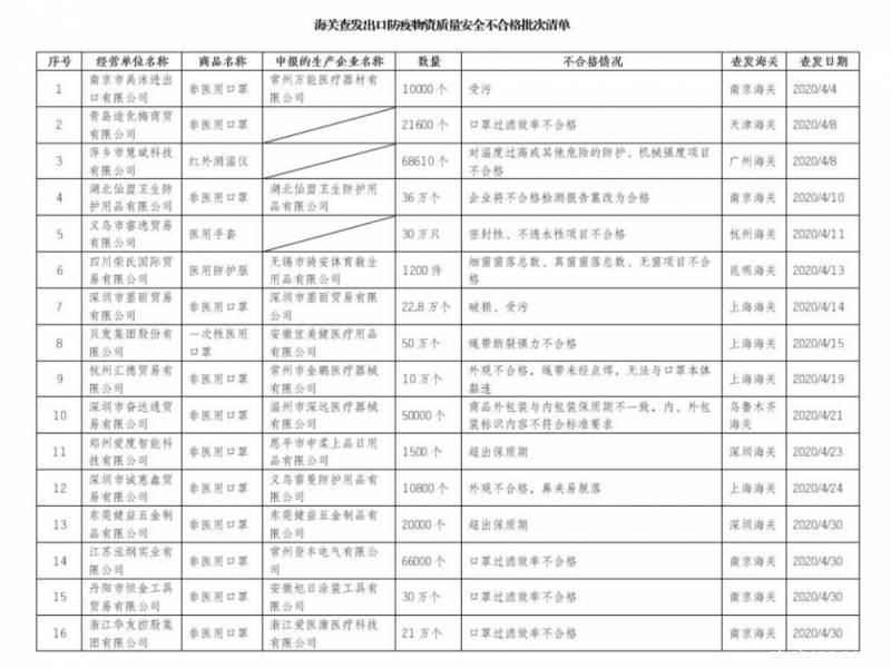 5月9日,中国海关总署公布全国海关近期查发出口防疫物资质量安全 不合格批次清单 , 点名16家出口企业 和与其相关的生产企业。