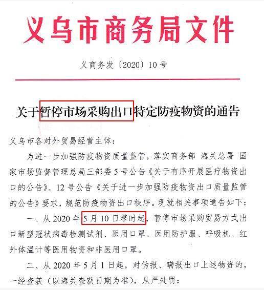 同一日,义乌市商务局出台《关于暂停市场采购出口特定防疫物资的通告》。