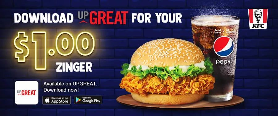 肯德基爷爷又给吃货们带来福利啦!原价7.3新币的Zinger汉堡+百事可乐套餐现只要1新币!大家只需要下载并注册UPGREAT App即可享受此优惠!