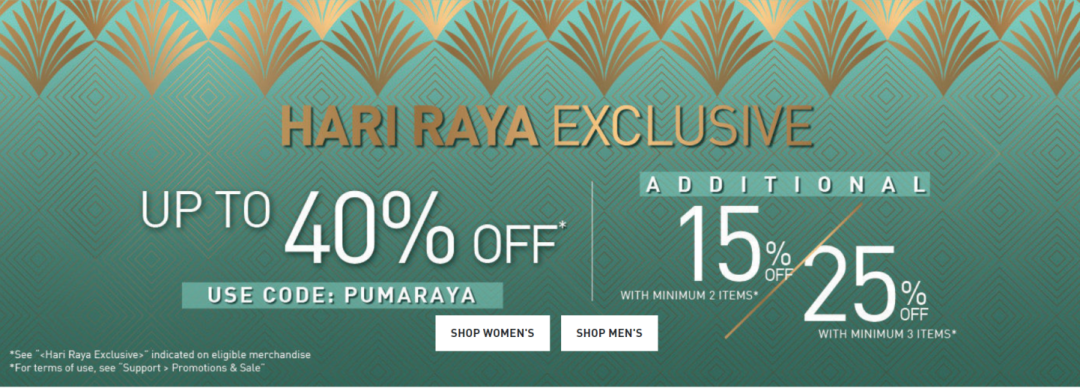 全球的穆斯林朋友终于要在今年的5月24日迎来开斋节了,在此期间运动品牌puma也放出了线上折扣,使用折扣码【PUMARAYA】购满两件享有85折,购满三件更享75折优惠噢!拉上小伙伴一起凑单吧~