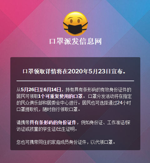 由淡马锡基金会提供的24小时自动售货机将以四种不同的语言提供指导,以指导居民完成口罩的领取过程。将于5月26日上午10点开始运营。公众可以访问MaskGoWhere网站以获取更多信息。