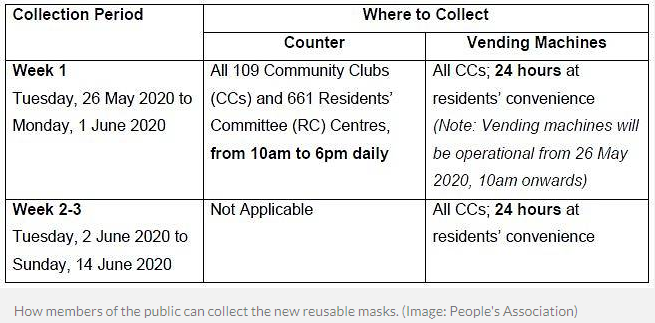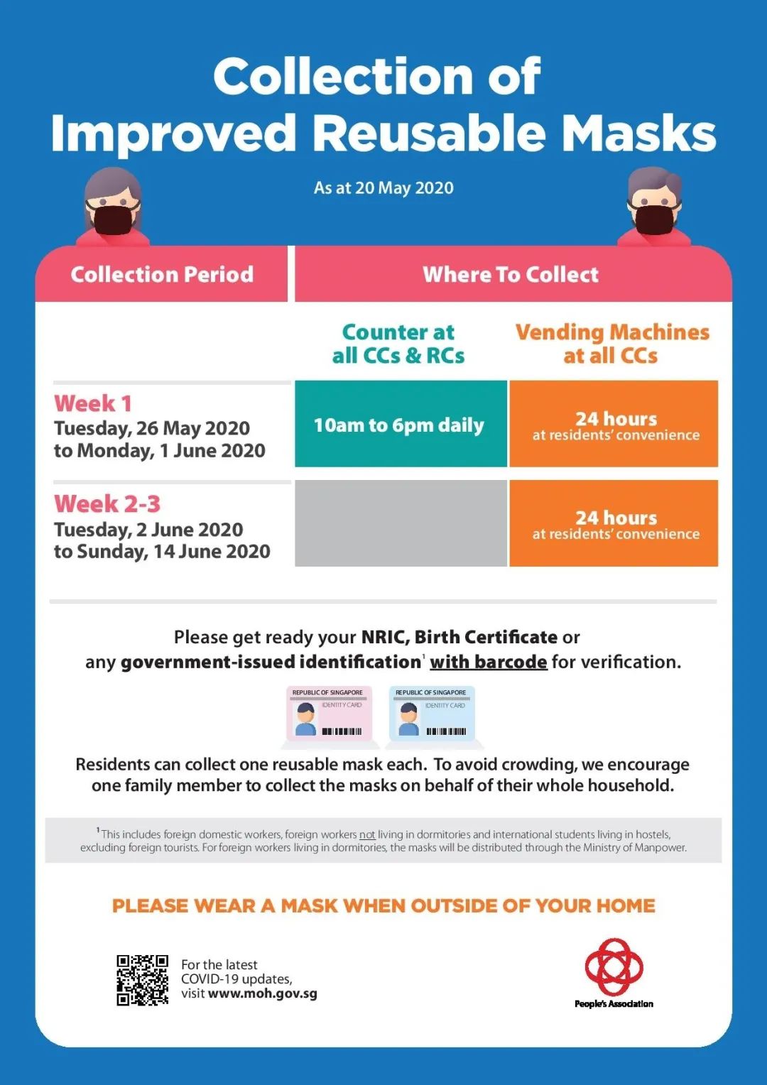 人民协会在星期四的媒体发布会上说,居民可以在所有社区俱乐部的24小时自动售货机上领取口罩,也可以于5月26日至6月1日在社区俱乐部和居民委员会的柜台领取。领取时间如下:
