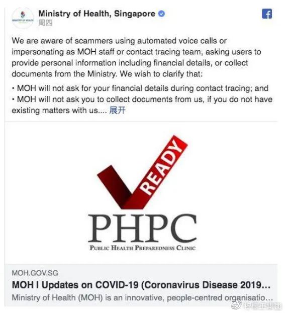 近日新加坡卫生部在Facebook上发布文章提醒民众,一定 要警惕有人冒充卫生部官员窃取个人信息!