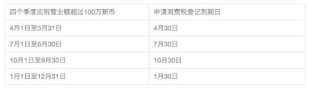 换句话说,您必须在每个季度结束时回顾您过去12个月的应税营业额,并在您的应税营业额12个月累计超过100万新币时注册消费税。如果您确定未来12个月的应税营业额不会超过100万新币,并可以提供相关文件证实,则不需要注册用于消费税。不过,您必须每年3月,6月,9月和12月底继续核实过去12个月的应税营业额。