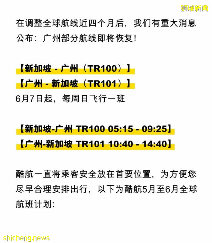 绿色通道开通后,6月1日之后会持续增加更多航班。之前,我们已经报道了关于酷航的最新航班:酷航重启4条航线,离回家的日子不远啦~~~有回中国或者来新加坡需求的人,可以多关注相关航空公司的官网信息。