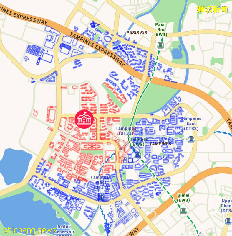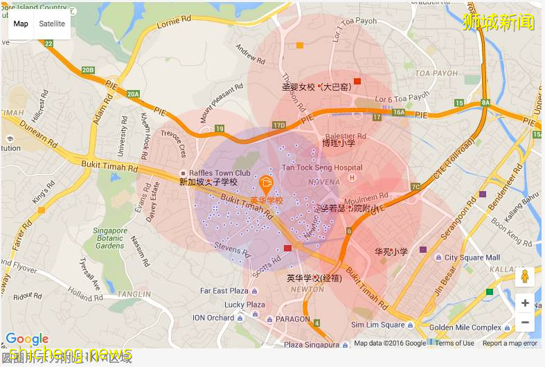 例如:OneMap的app上显示的淡滨尼的华文特选学校培青小学,红色是1公里范围,蓝色是1-2公里范围