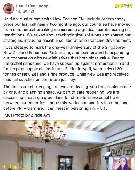 昨日,李显龙总理在Facebook上发表了与新西兰总理Jacinda Ardern 进行线上会谈的情况。