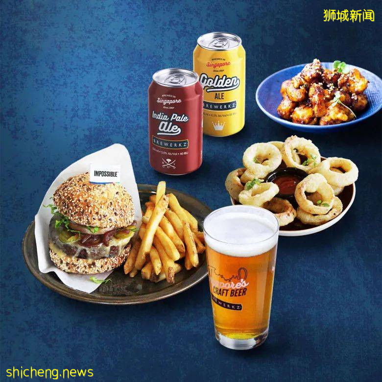 Brewerkz在今天推出了植物肉汉堡啤酒套餐,汉堡是使用植物肉饼制作而成,再搭配芥末酱、洋葱彩椒酱、番茄、莳萝泡菜、生菜。套餐里还有沙拉、薯条和一罐Brewerkz啤酒。如果想要将薯条换成洋葱卷或韩式辣酱炒花椰菜,只需额外支付2新币就可以了。