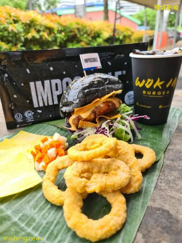 这家餐厅推出的植物肉汉堡,充满了本地风味,所制作的肉饼主要以萝卜丁和栗子为食材,再用麻油腌制入味,配上炸云吞皮、辣味美乃滋、蔬菜、竹炭面包。汉堡搭配洋葱卷和一杯饮料,套餐仅售18.8新币。