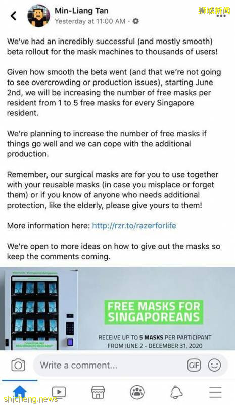 他也说,他们将从6月2日起,每位新加坡居民可获5个免费口罩。