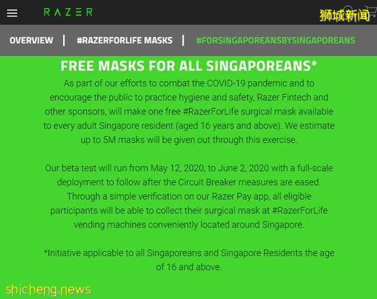 雷蛇在官网公布“Razer For Life”运动,透过口罩自动贩卖机派发医疗口罩给新加坡国民。
