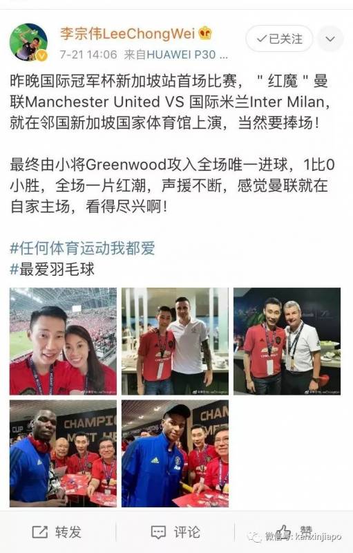 刚退役不久的羽毛球名将李宗伟也前来观赛!直呼感觉曼联就在自家主场,看得尽兴啊!