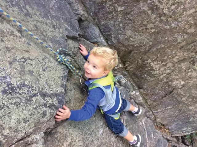 “Our son Micah at 18 months, working on his try-hard face as he cruises up a 5.1 toprope route at the Red River Gorge, Kentucky.”