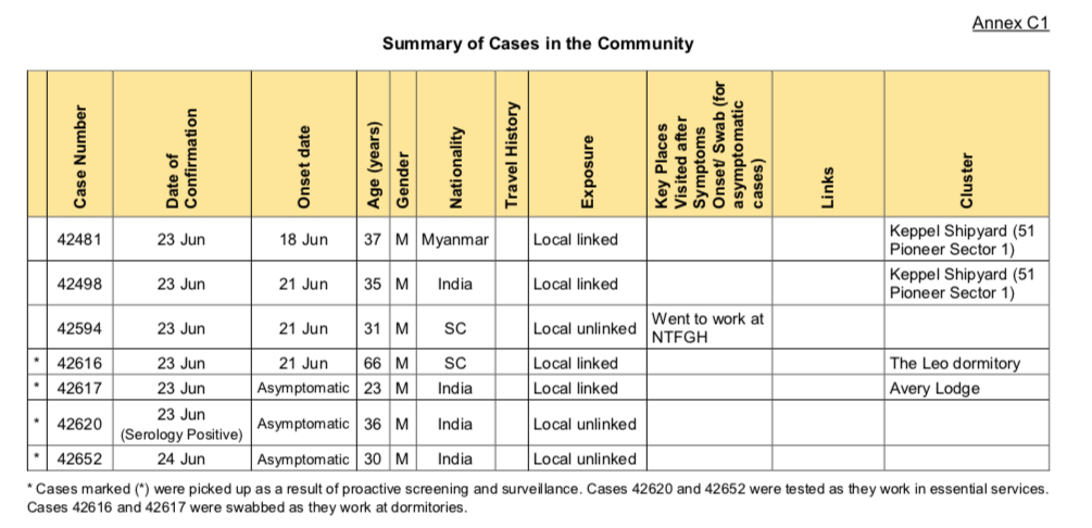 (来源:MOH)新增一名男护士病例 有7个社区新增病例,包括两名新加坡公民、两名工作准证持有者和两名工作许可证持有者。 有4例是卫生部主动筛查发现的,包括两名在客工宿舍工作的人员,和两名从事必要服务的人,他们都是无症状感染者。