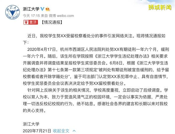 努某某被判强奸罪后发的朋友圈 事实上,这并非浙江大学首次引发的处分争议了,在这之前,浙大曾给予吸毒学生留校察看处分,该生在2019年12月被判处了行政拘留。但在2014年,曾有学生因为盗窃罪被法院同样判处有期徒刑并暂缓执行,却被开除学籍。相比之下,强奸、吸毒和盗窃孰轻孰重?