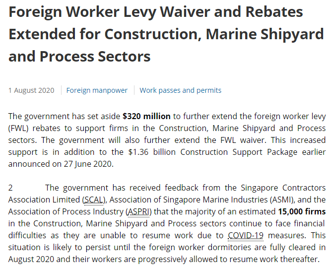 政府已收到新加坡承包商协会(SCAL),新加坡海事工业协会(ASMI)和加工工业协会(ASPRI)的反馈意见,其中估计有15,000家建筑、海洋造船厂和加工公司中的大多数由于疫情措施无法恢复工作,因此各行业继续面临财务困难。这种情况可能会一直持续到2020年8月外国工人宿舍完全清理完毕并逐步允许其工人恢复工作为止。