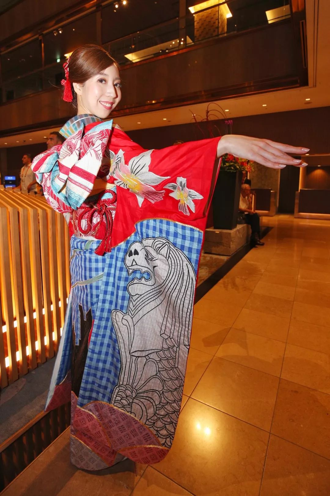 和服上绣有鱼尾狮、国花胡姬花和金沙酒店一带的风景(这和服上的鱼尾狮的鼻孔居然是爱心形的???略特别……)。