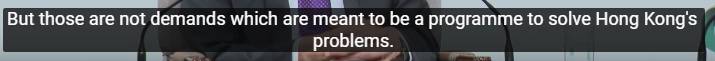 10月16日,李显龙在福布斯会议上说:“他们(香港示威者)表示有五大诉求,缺一不可。但是这些诉求并不是解决香港问题的方案,其目的是要羞辱和逼特区政府下台。”