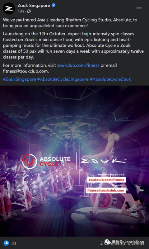 据了解,为妥善利用夜店空间,ZOUK与飞轮健身房(Absolute Cycle)展开有氧健身合作。两层楼的空间可共容纳50部室内脚踏车,加上夜店现成的音响、灯光和干冰机器,非常适合飞轮健身。