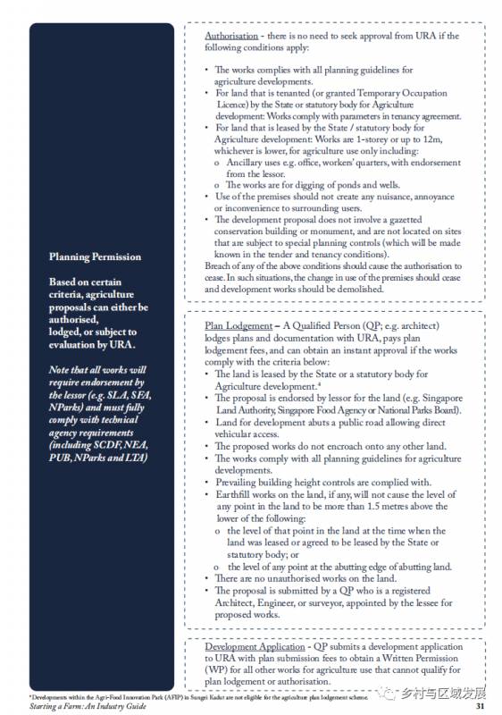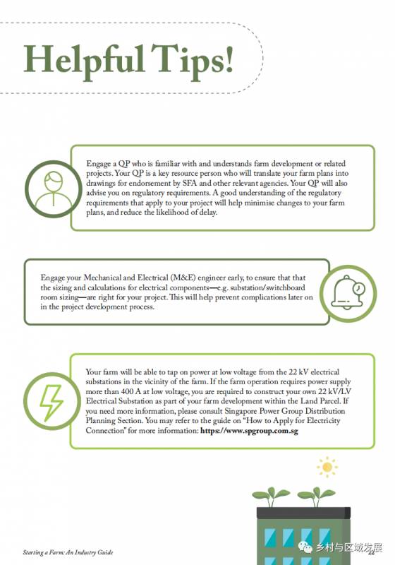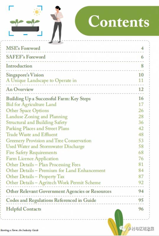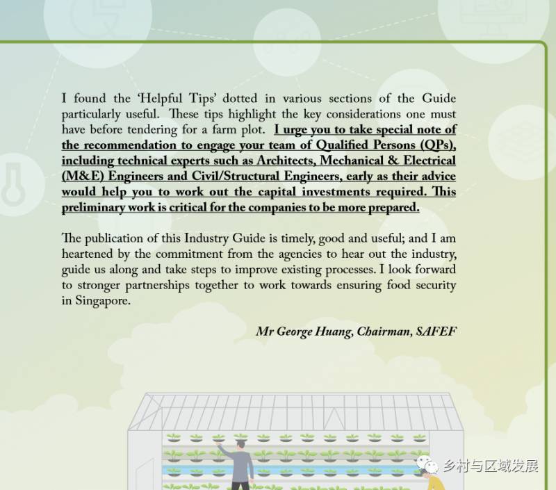 新加坡570万人口,国土面积725平方公里,其中农业土地面积仅3000亩,农产品有效自给水平仅为10%,这或许是新加坡如此珍视农业土地,重视农场开发细节的原因,每一寸土地都要得到最高效利用。反观国内农业项目开发,动辄成千上万亩,几万亩,甚至几十万亩,特别在社会资本主体进入方面,缺乏有效的引导和约束,造成大量土地、资金等资源浪费,重复投资等,资本方也损失惨重,国内是否可以学习新加坡这样,通过行业或政府有效顶层设计引导,及过程监督实施,全过程全周期服务促进社会资本进入农业农村领域有序良性健康发展,也是很好的。以下内容为最新新加坡农场指导手册原文: