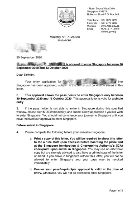 提交好入境许可申请后,一般来说会在1-2周内出结果,然后以邮件的形式通知学校。学校在接到通知后,学生需要在线支付186新币的核酸检测费用给新加坡教育部。缴费后的2-3个工作日,教育部将会发放正式的入境许可(如下图)。