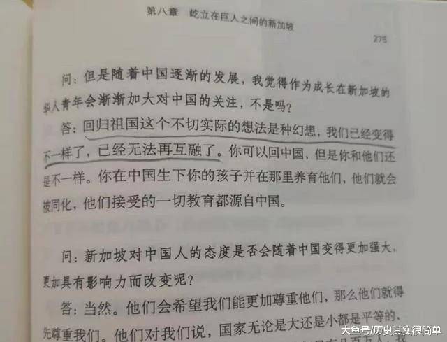 李光耀的态度是决绝的,同时也相当坦诚,一点不藏着掖着,记者说:“随着中国的日渐强大,新加坡的年轻人总会越来越关注中国的。”李光耀似乎看到了记者这句话背后的深意,他的回答说:回归祖国这个不切实际的想法是幻想,我们已经不一样了,已经无法融合了。