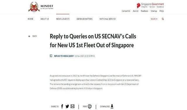 声明表示,按照2012年达成的协议,新加坡同意美国在本国轮换部署最多四艘濒海战斗舰。这份协议至今有效。美国国防部没有提出在新加坡增加部署舰艇的要求,新加坡也没有同美方进行相关讨论。