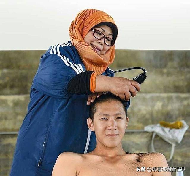 图:新加坡入伍生与新加坡部队从外面请来,专门剃光头的理发阿姨。