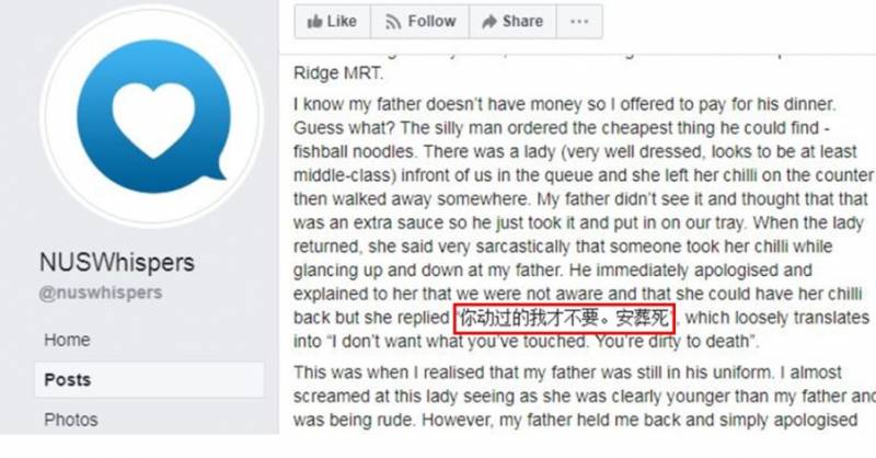 这则贴文星期五(25日)发布在国大的匿名倾诉渠道NUSWhisper。