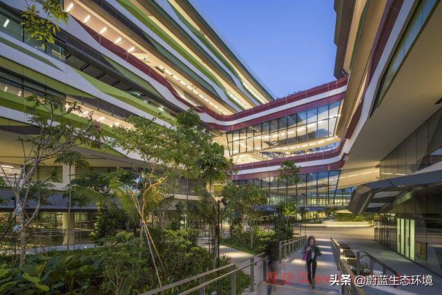 低水消耗原生景观树种将其从外部区域织入建筑结构中,以减少城市热岛效应
