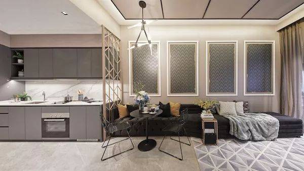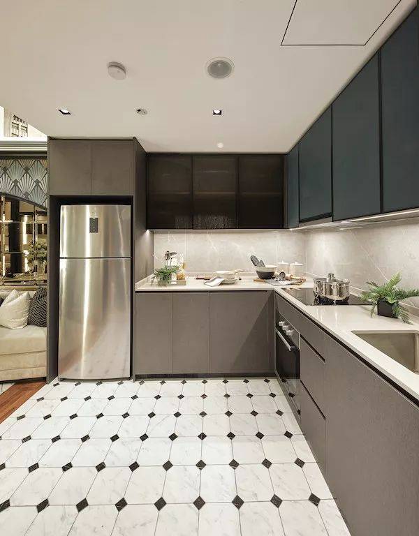 相比之下厨房的设计则是用了深灰的色调,而大理石板用于背景颜色,使空间看起来高档而典雅。淋浴区也是同样使用了深灰色的瓷砖,以唤起怀旧之情。