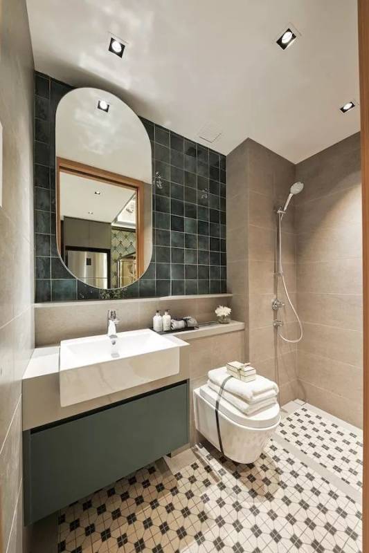 从外观上看,整个设计着重在每个单位与其现代的线形设计的延续,为了强调店屋的魅力,浴室的设计以绿色为主要色调的瓷砖等材料。洗手间的镜子是一个胶囊型的设计圆润中又不失线条感,一种复古的情怀,镜子的后面是一个储物柜。