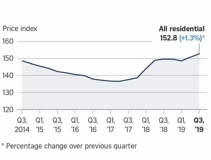 2019年第三季度非拥有地私人住宅价格较上一季度上涨1.3%,超过预估的0.9%,延续了2019年第二季度1.5%的涨幅,与此同时房价也上涨了1%。
