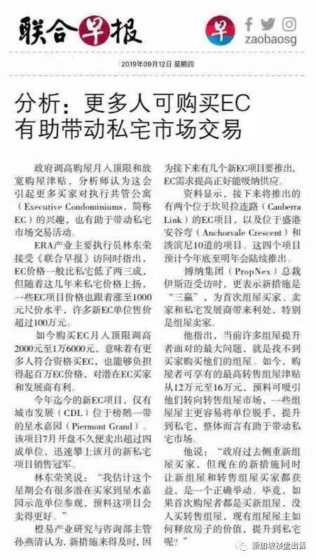 政府调高购屋月入顶限和放宽购屋津贴,分析师认为这会引起更多买家对执行共管公寓(Executive Condominiums,简称EC)的兴趣,也有助于带动私宅市场交易活动。