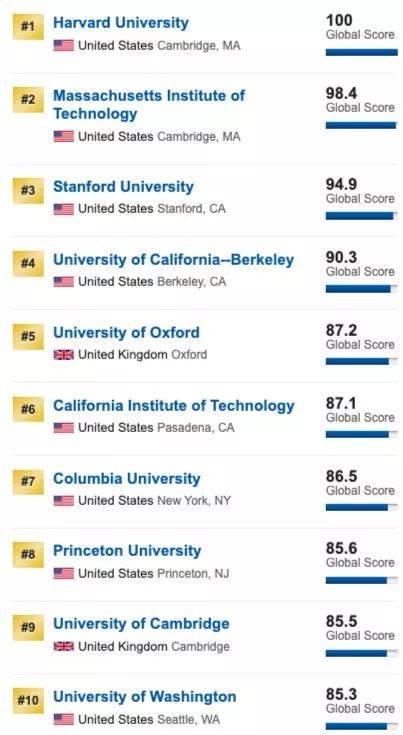最新排名里美国大学一骑绝尘